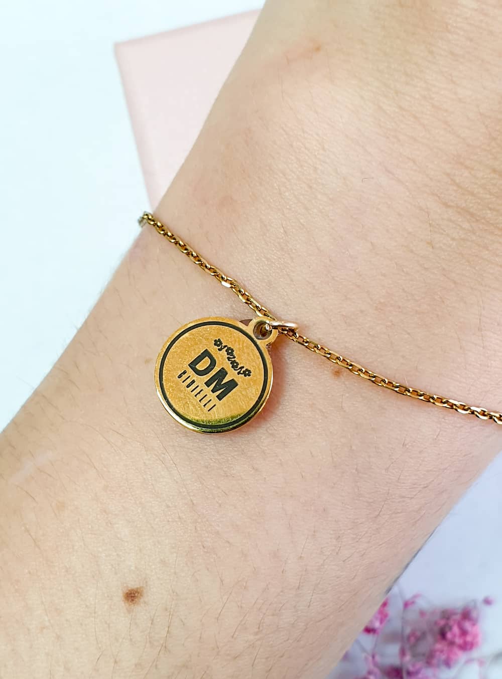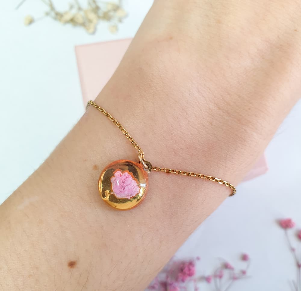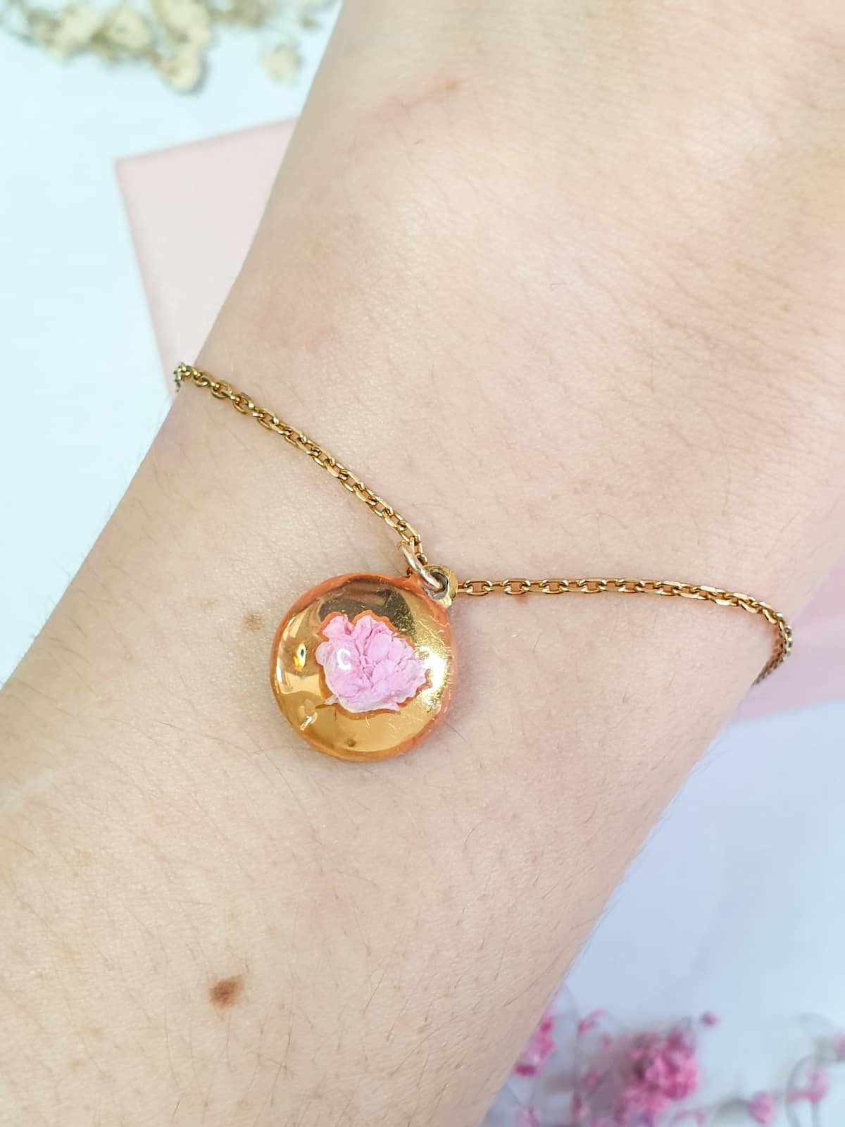 Bracelet with DM Gioielli engraved pendant and micro resin flowers.