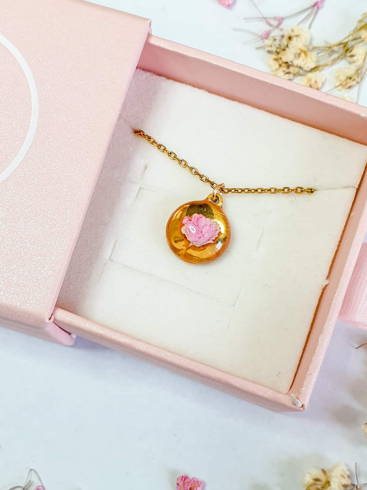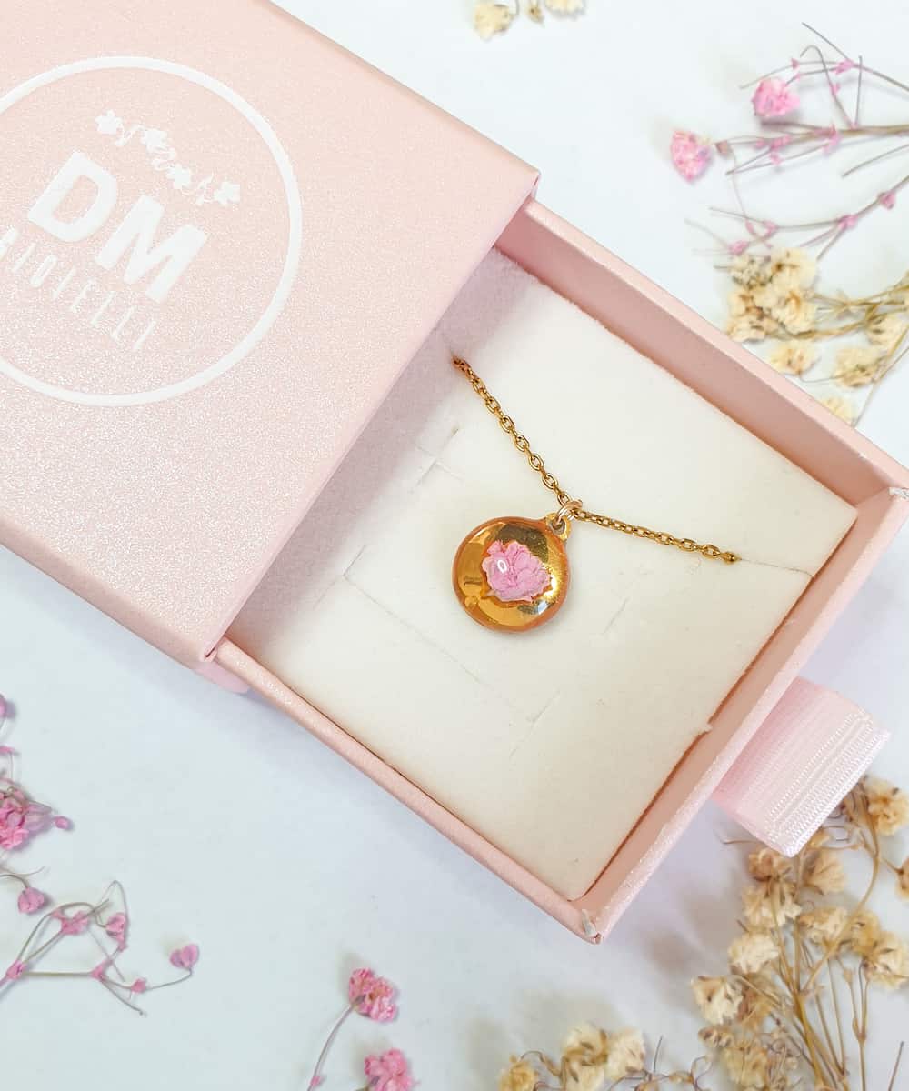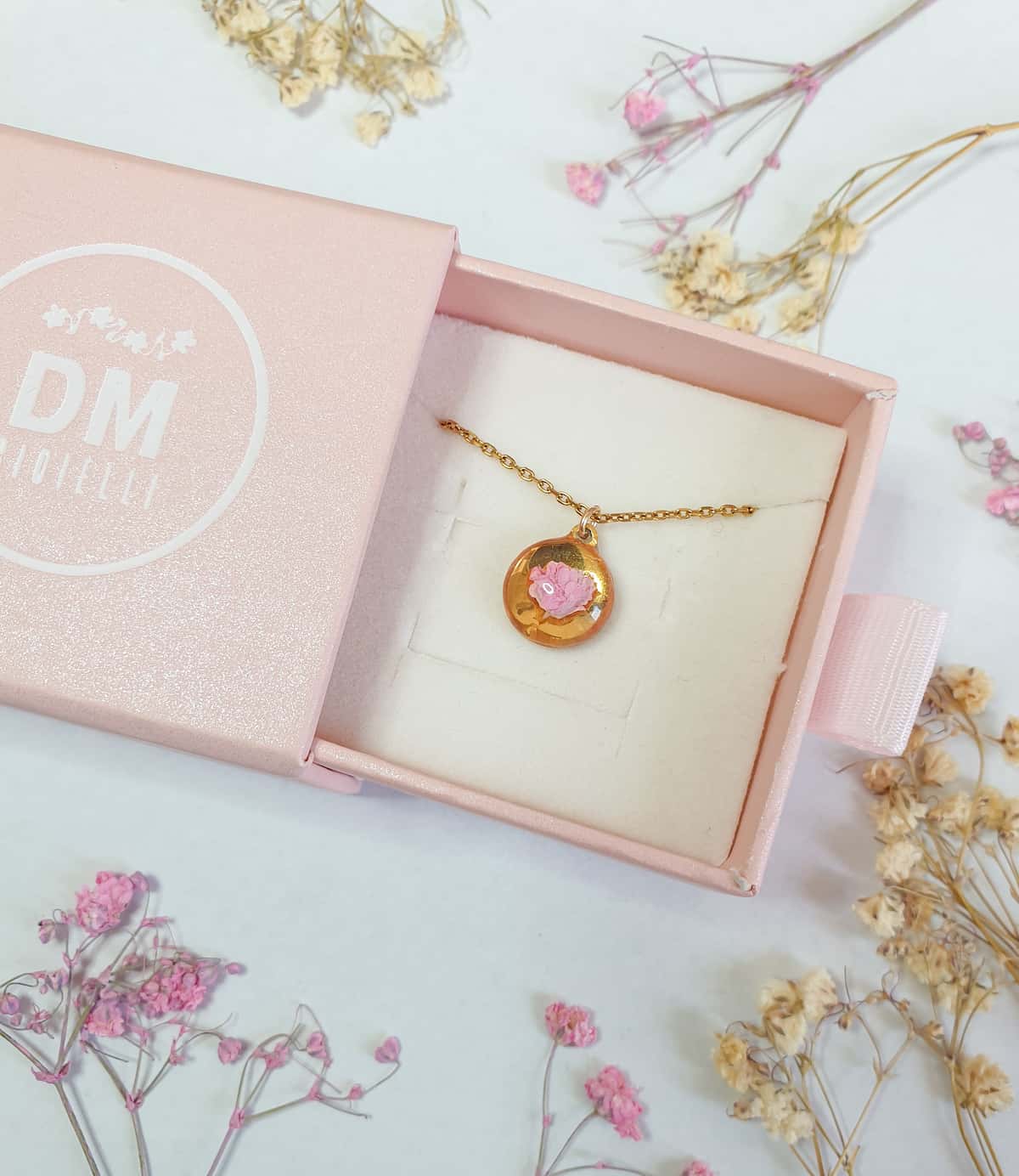 Bracelet with DM Gioielli engraved pendant and micro resin flowers.