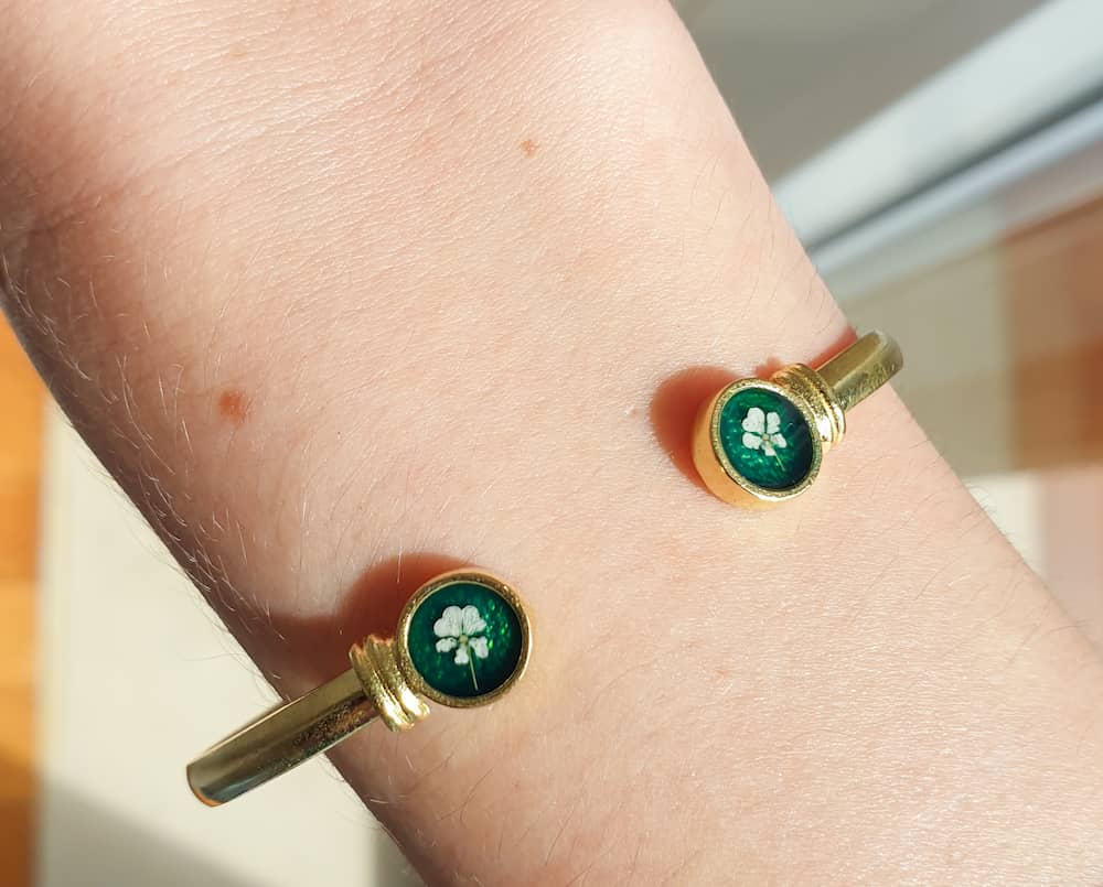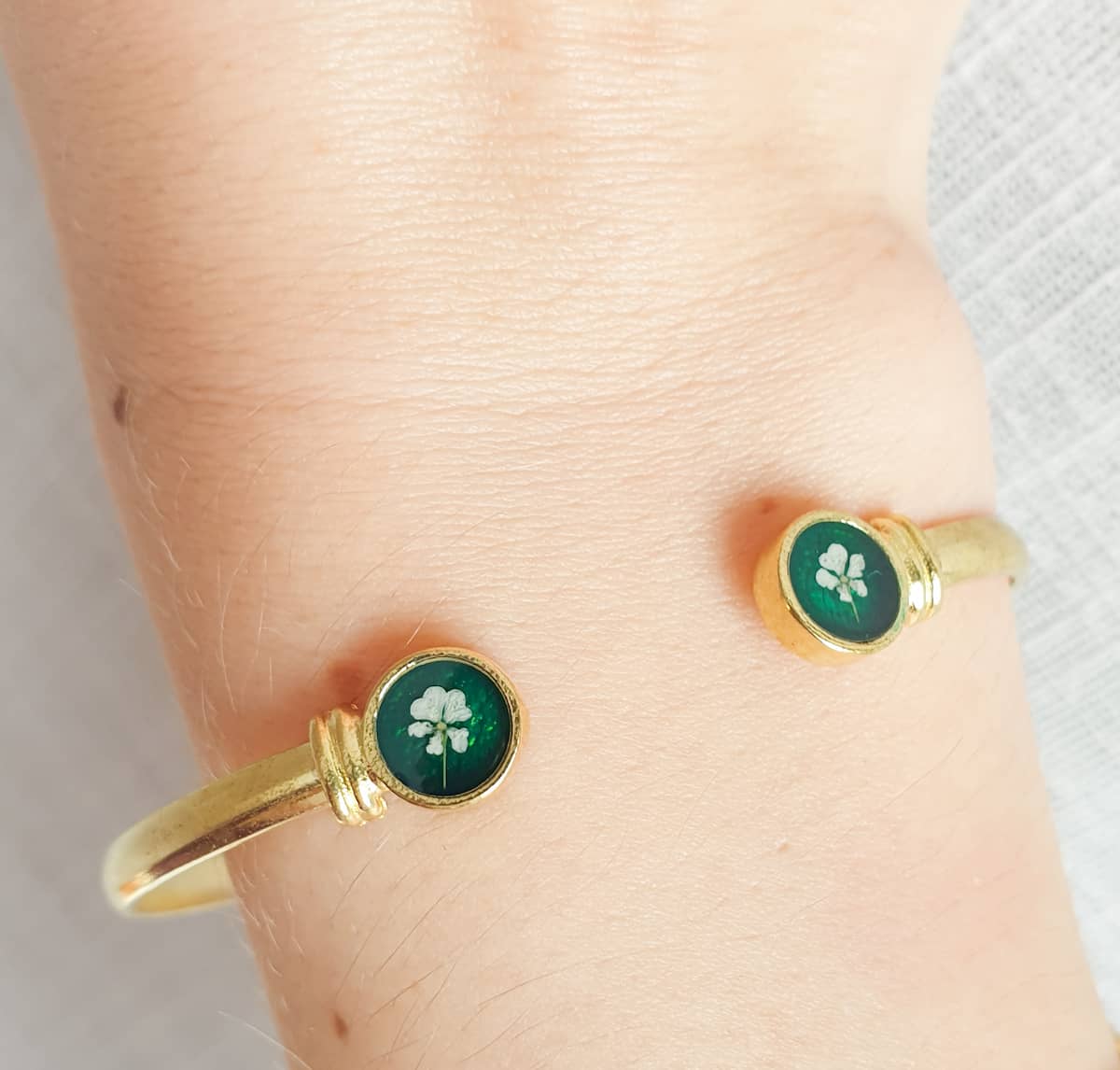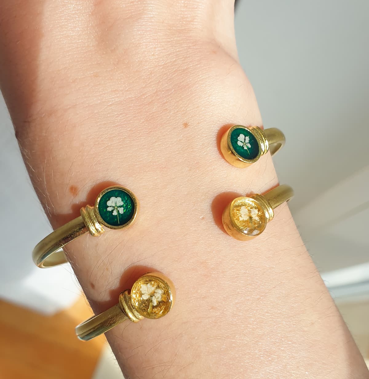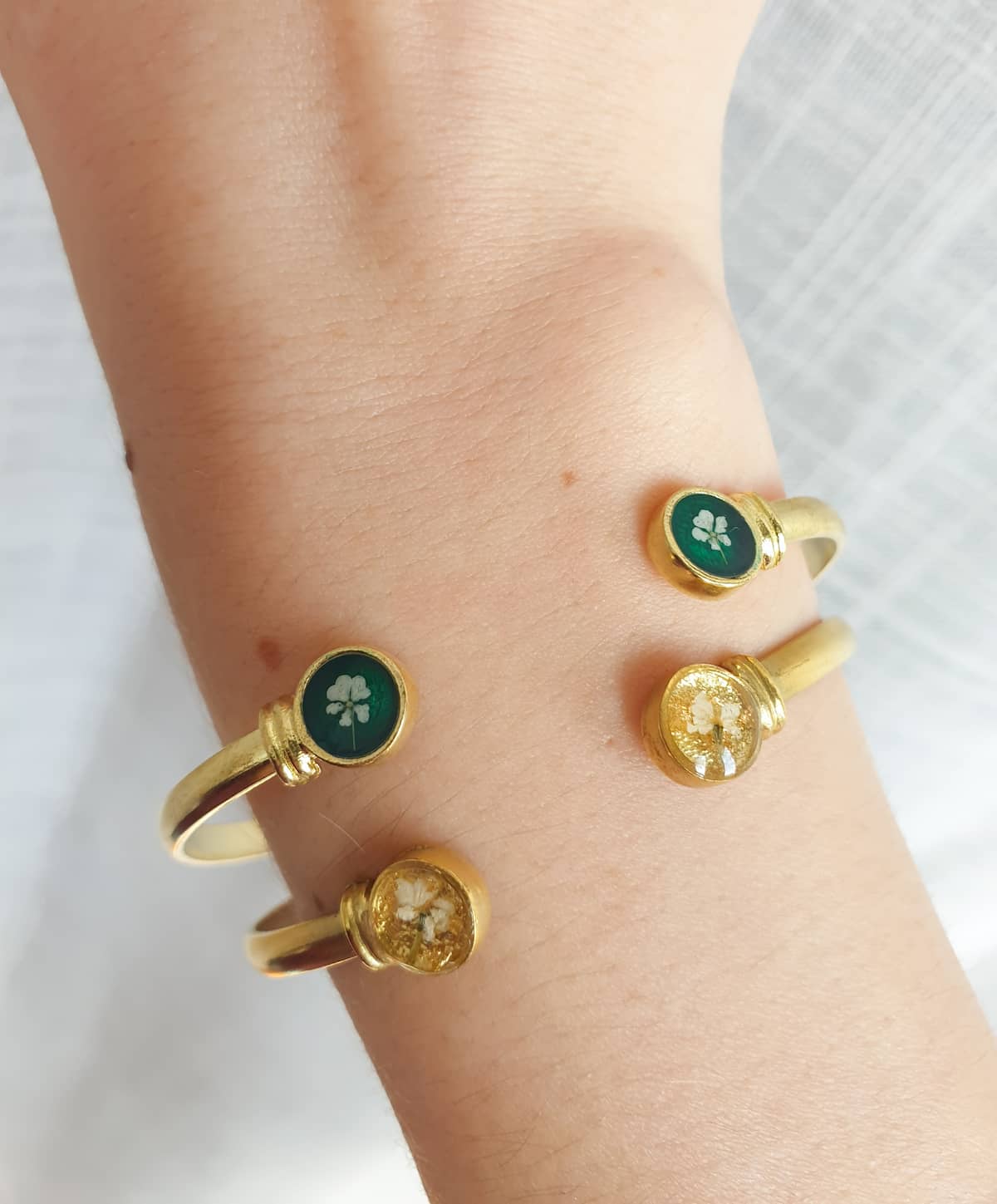 A plated brass bangle featuring tiny resin flowers. Adjustable.