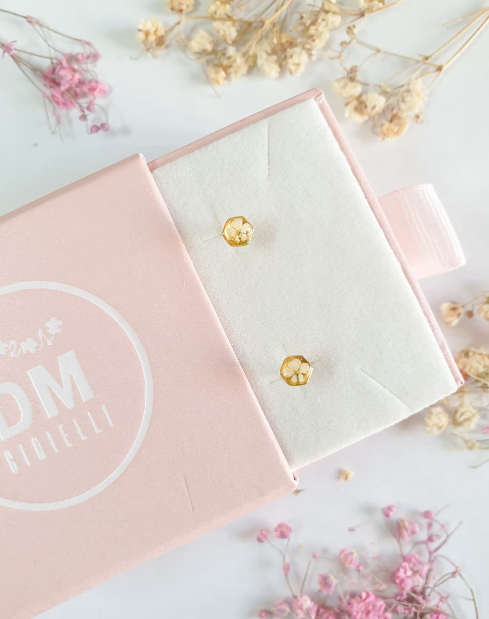 Materials: resin, 925 silver, 18k gold-plated 925 silver, 18k gold-plated brass or silver, real flowers. Handmade in Italy.