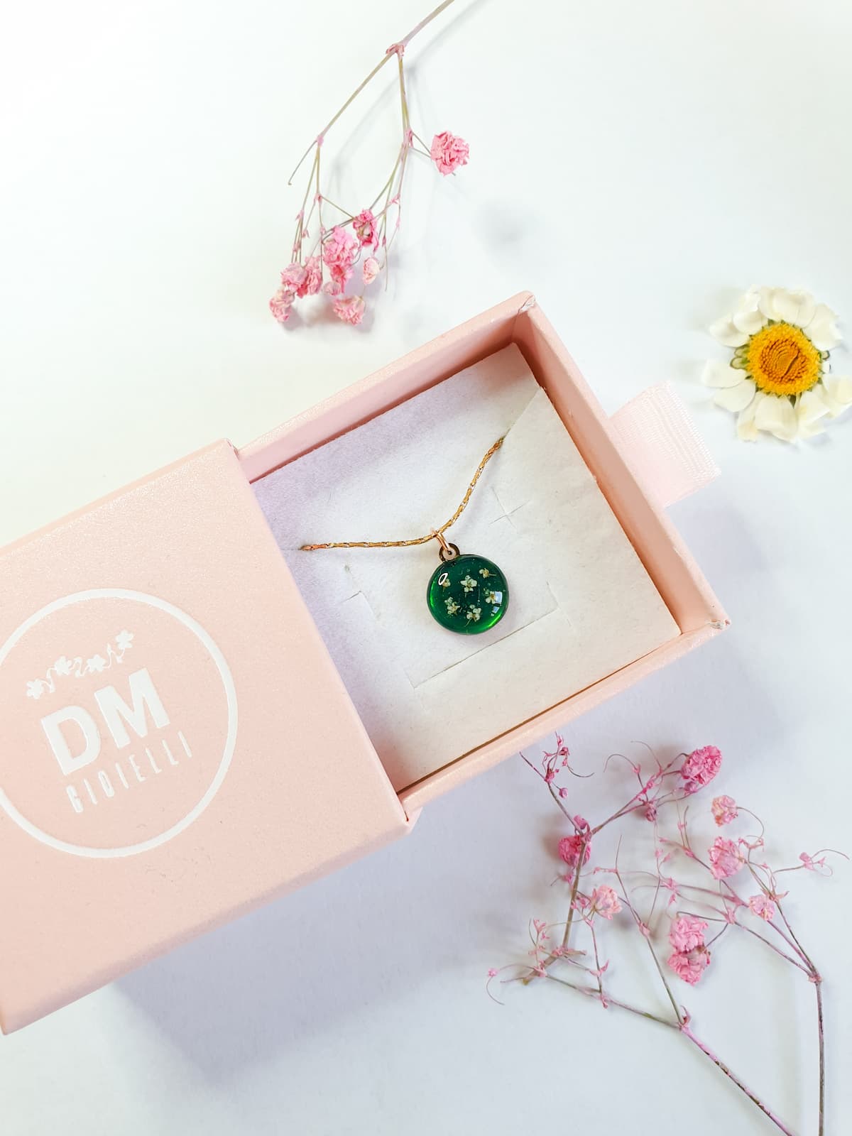 Collana con pendente a cerchio inciso DM Gioielli e micro fiori in resina su base pigmentata.