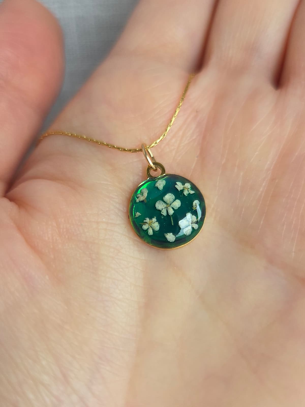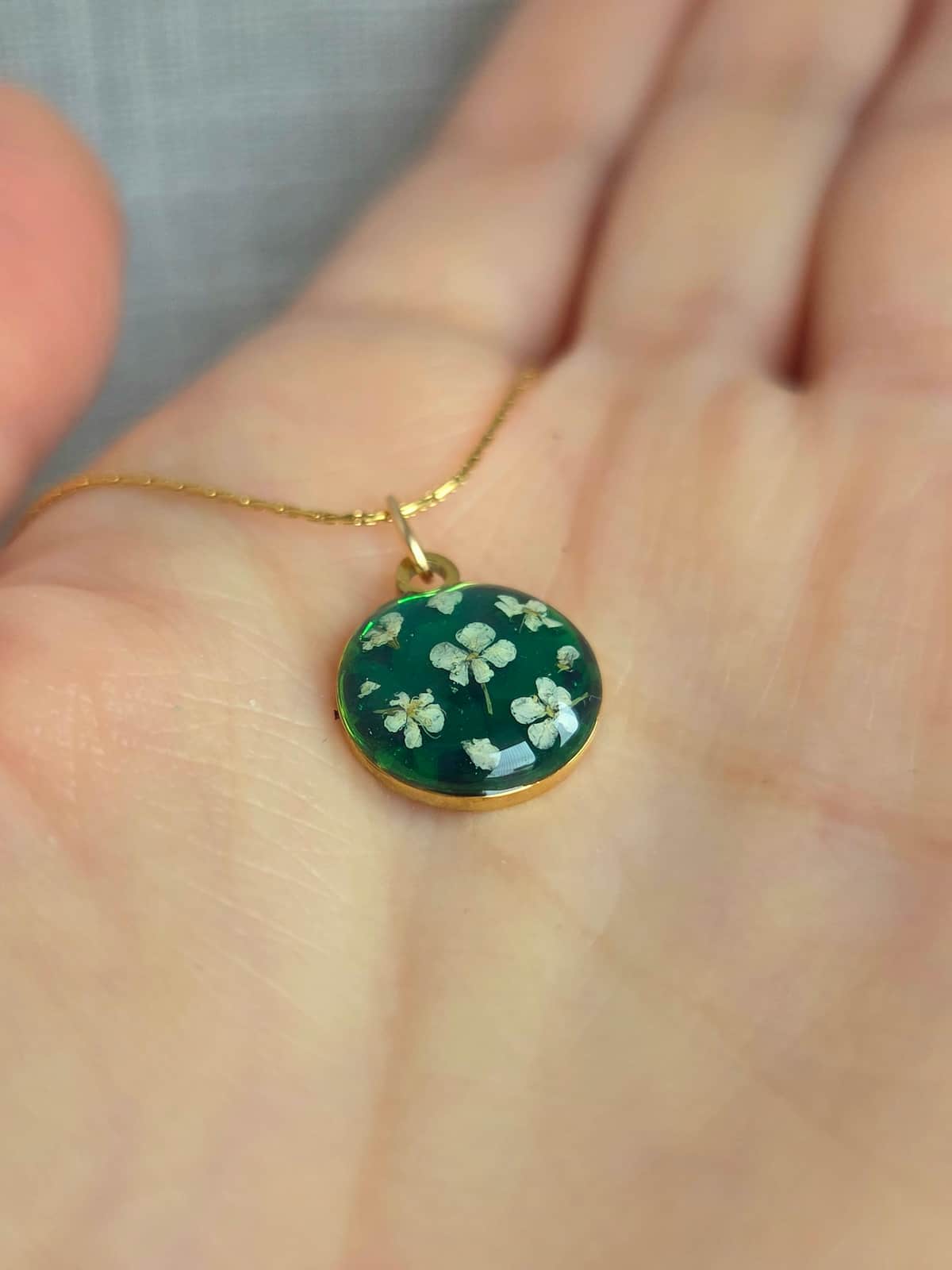 Micro fiori veri essiccati e trattati in resina per creare una collana elegante, dall'aspetto raffinato.