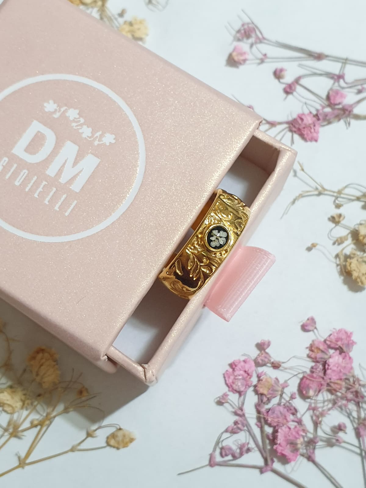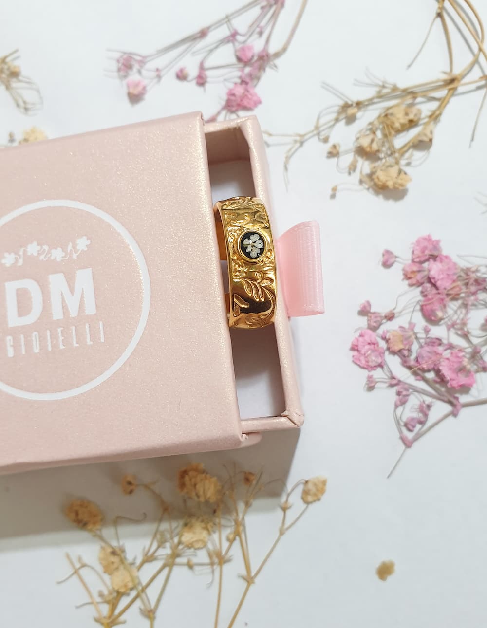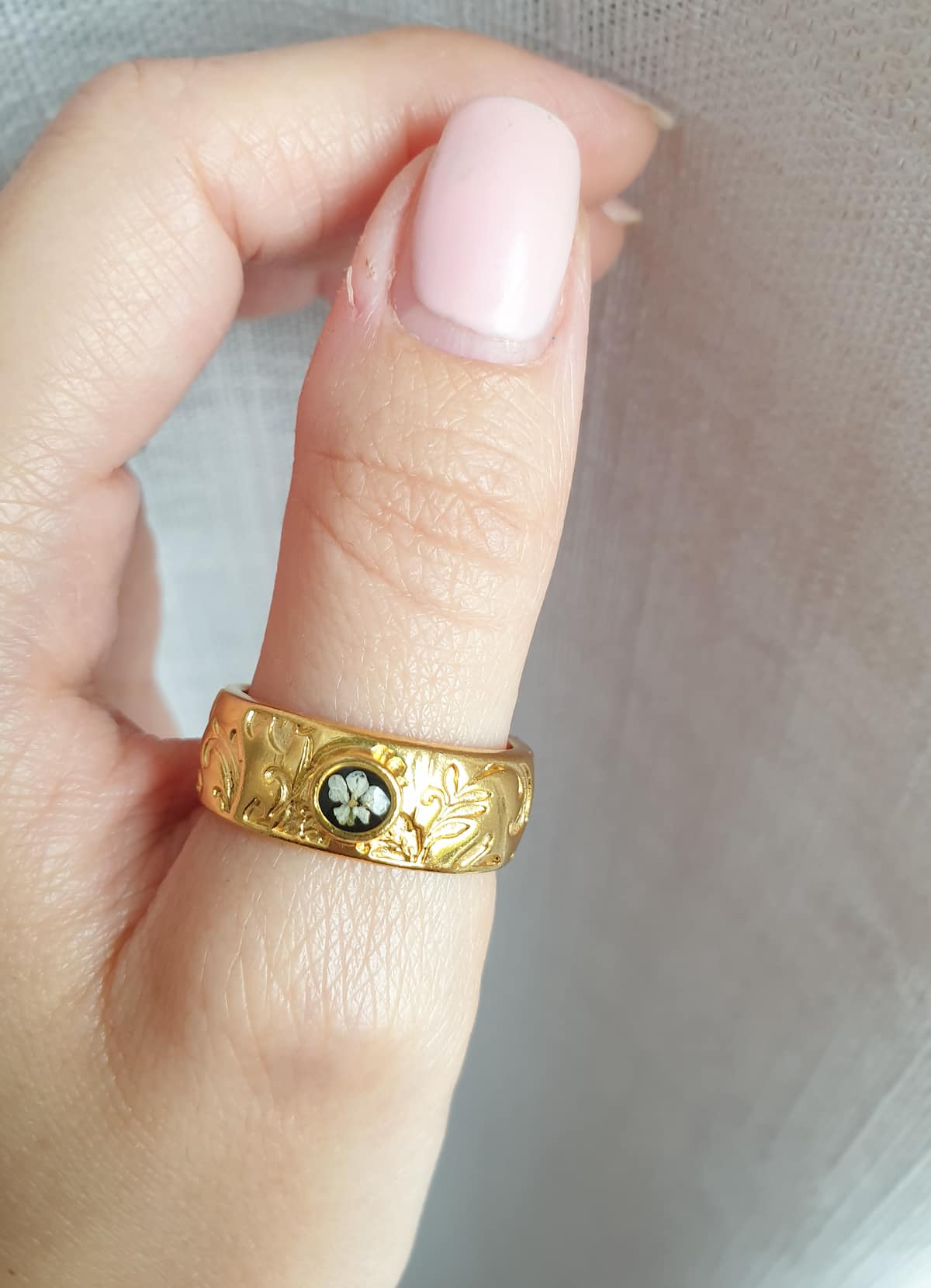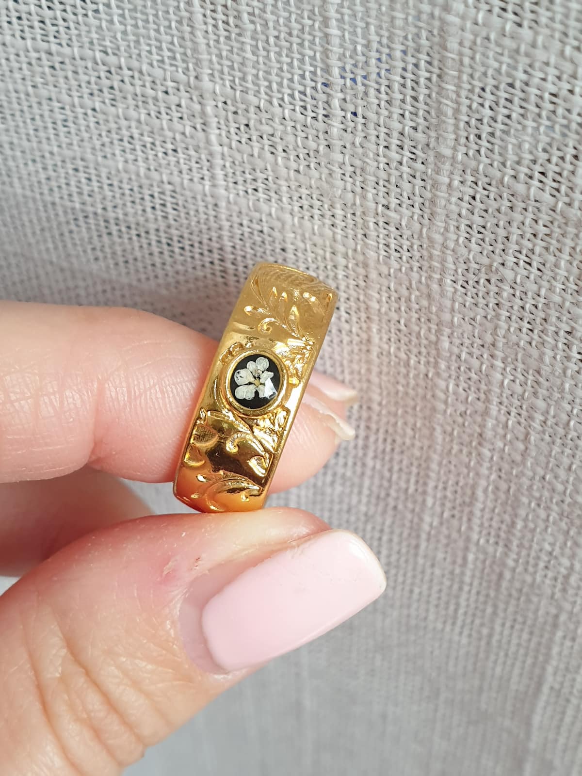 Anello regolabile a fascia in ottone placcato oro 24k lavorato con incisioni floreali con micro fiorellino di carota selvatica bianco su base in resina nera.