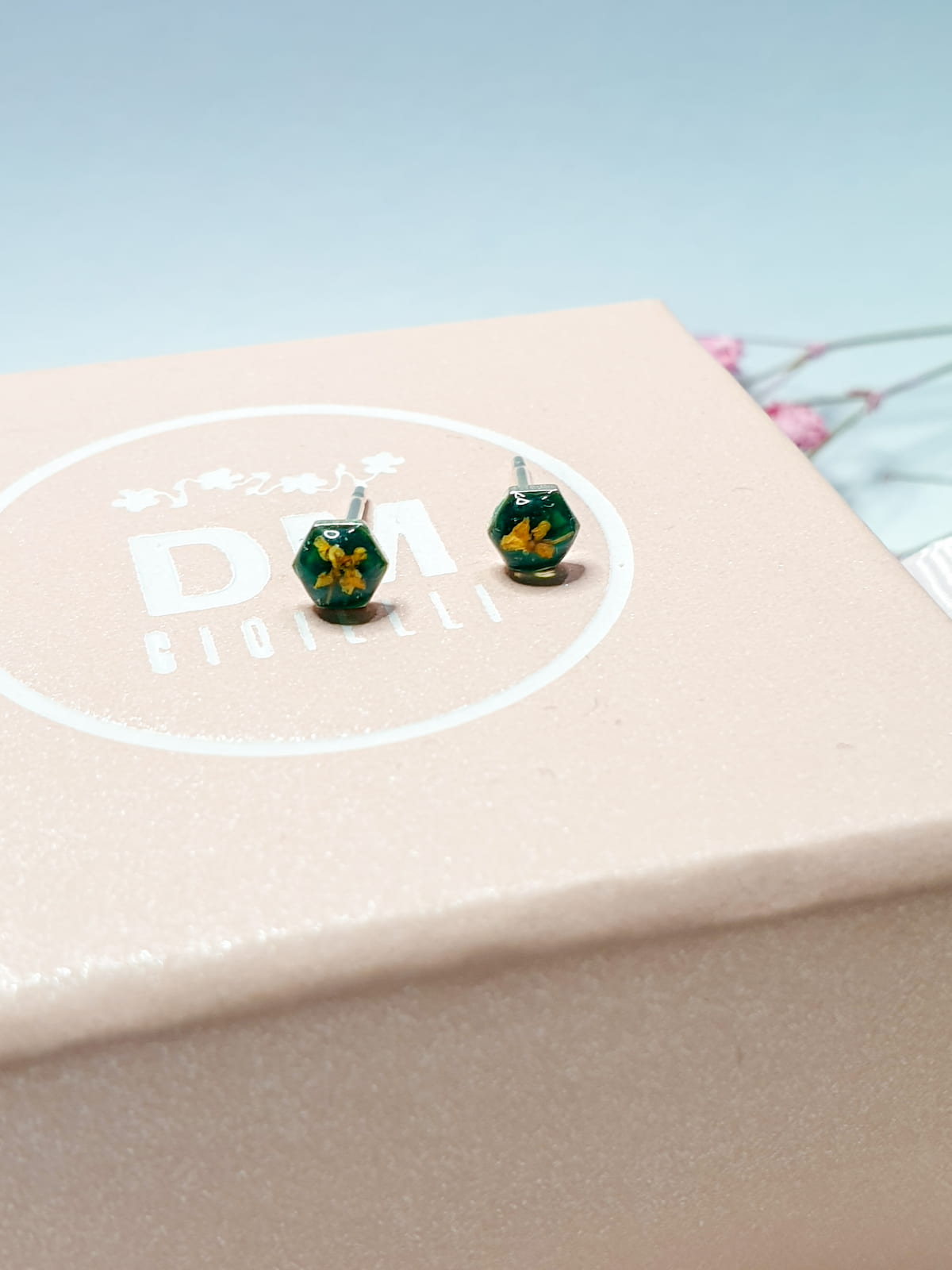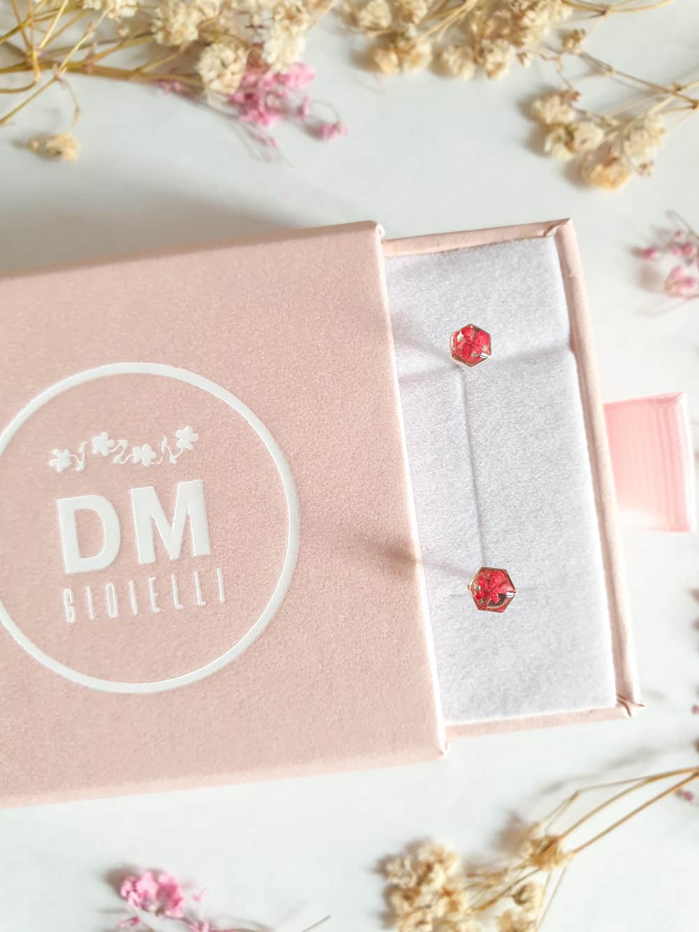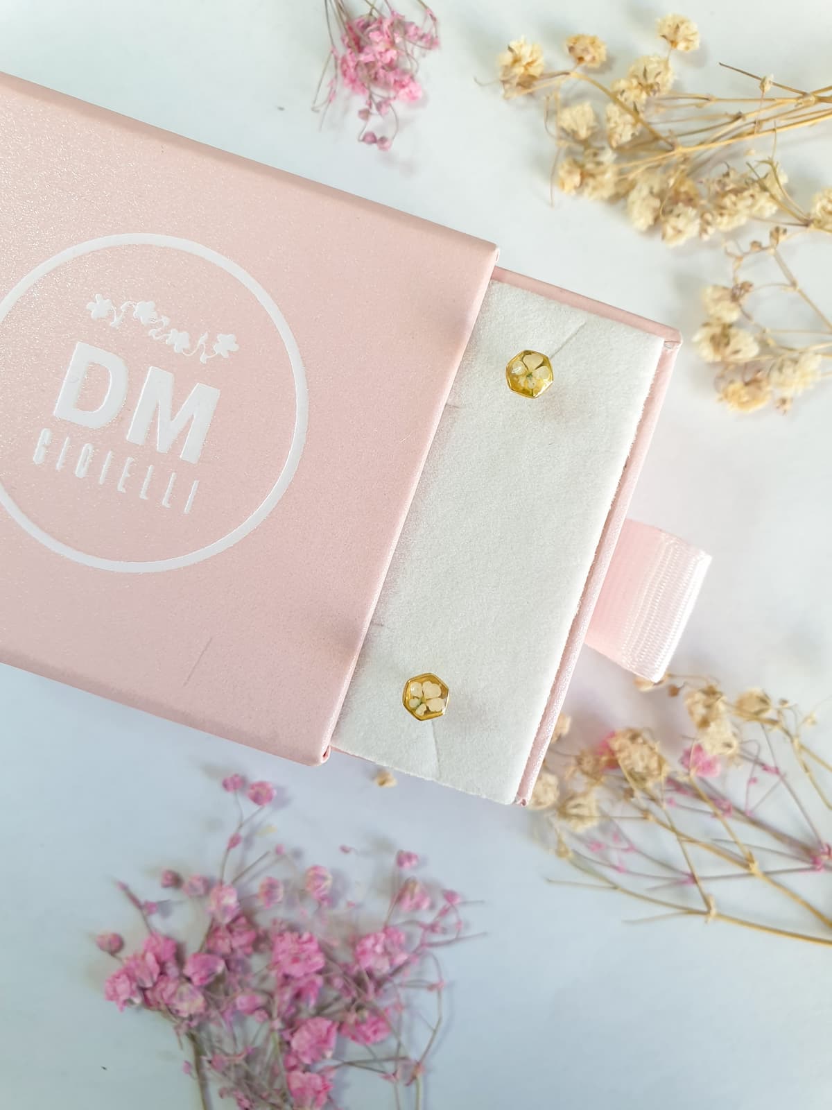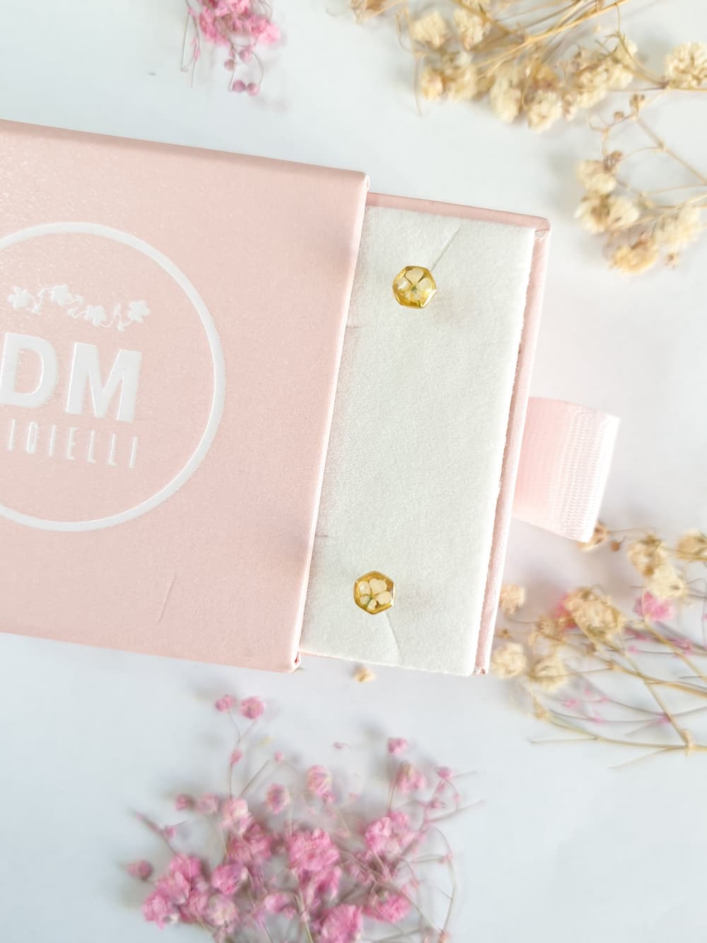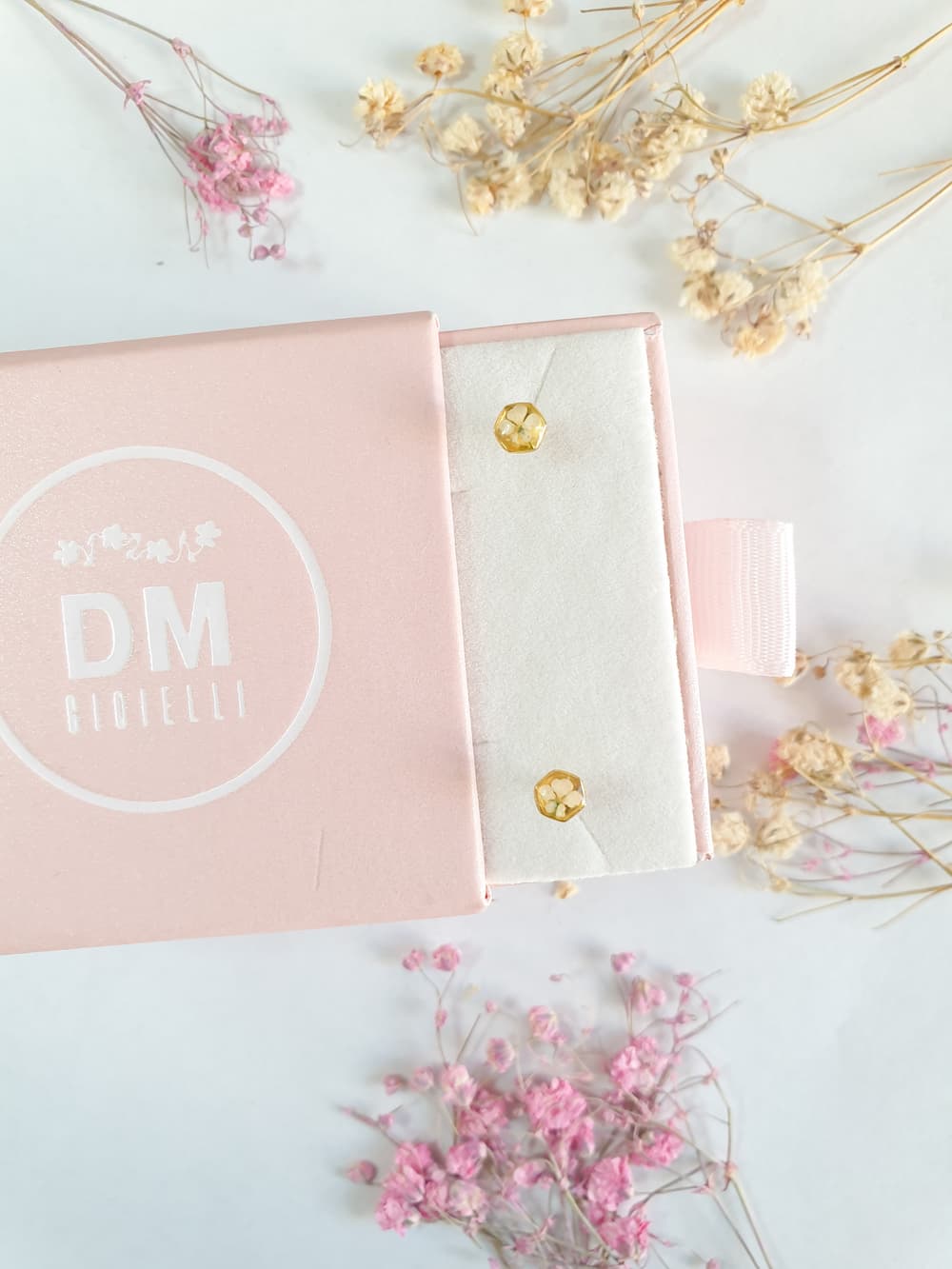 Materiali: resina, argento 925 e argento 925 placcato oro 18k, fiori veri