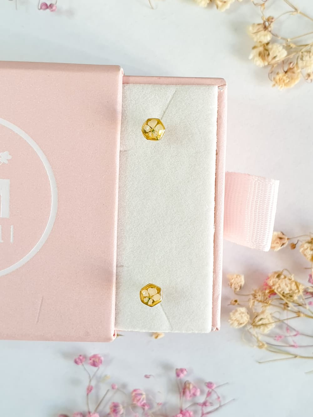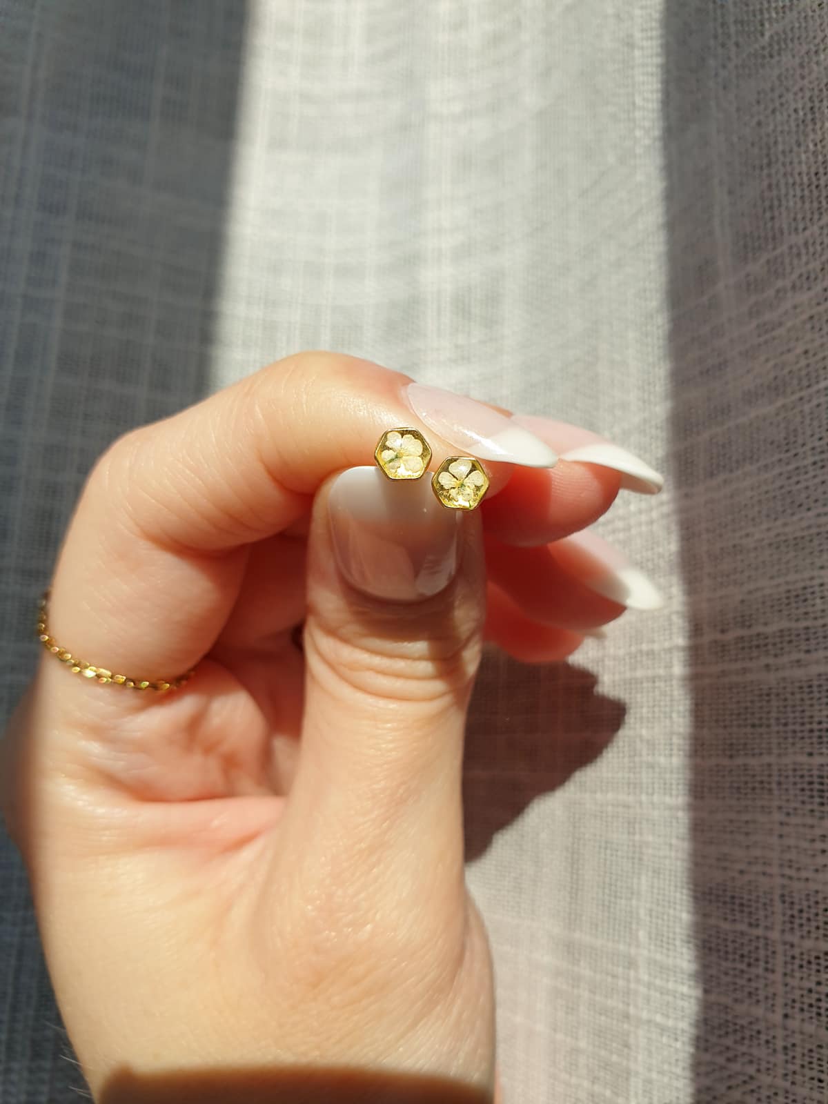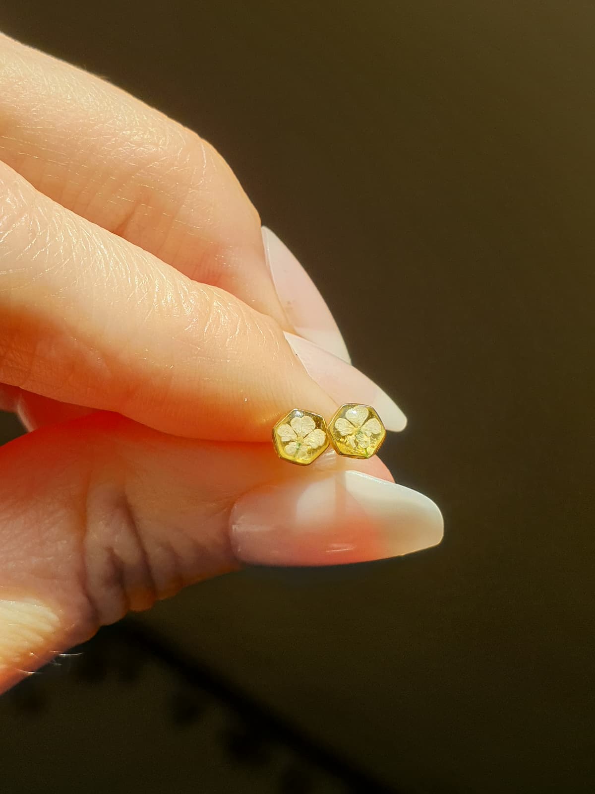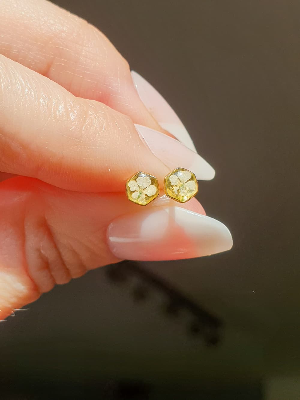 Orecchini a lobo in argento 925 e argento 925 placcato oro 18k: piccolo esagono di 4mm con micro fiori di carota selvatica in resina.