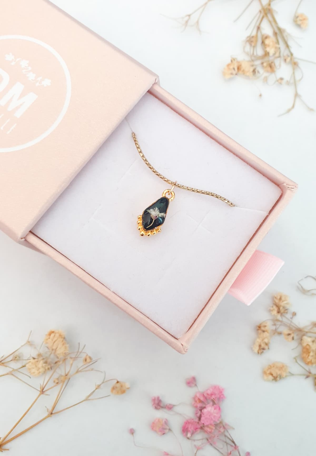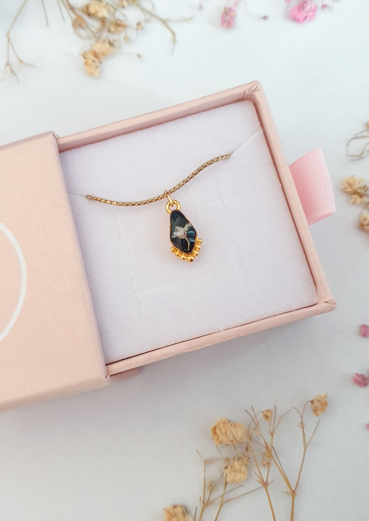 Materiali: fiori veri, acciaio inossidabile, ottone placcato oro 18k, resina