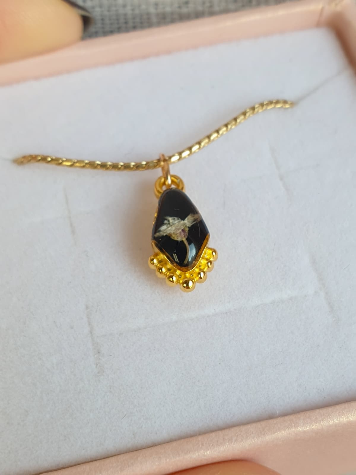 Collana in acciaio inox con pendente in ottone placcato oro 18k che racchiude un micro fiorellino di alisso bianco su sfondo nero.