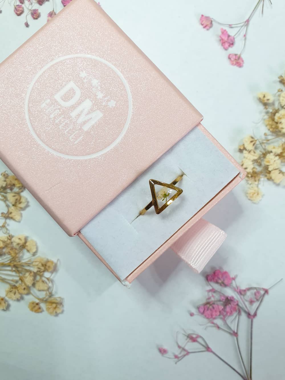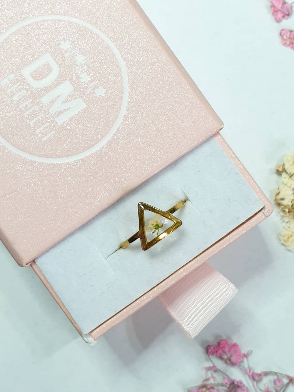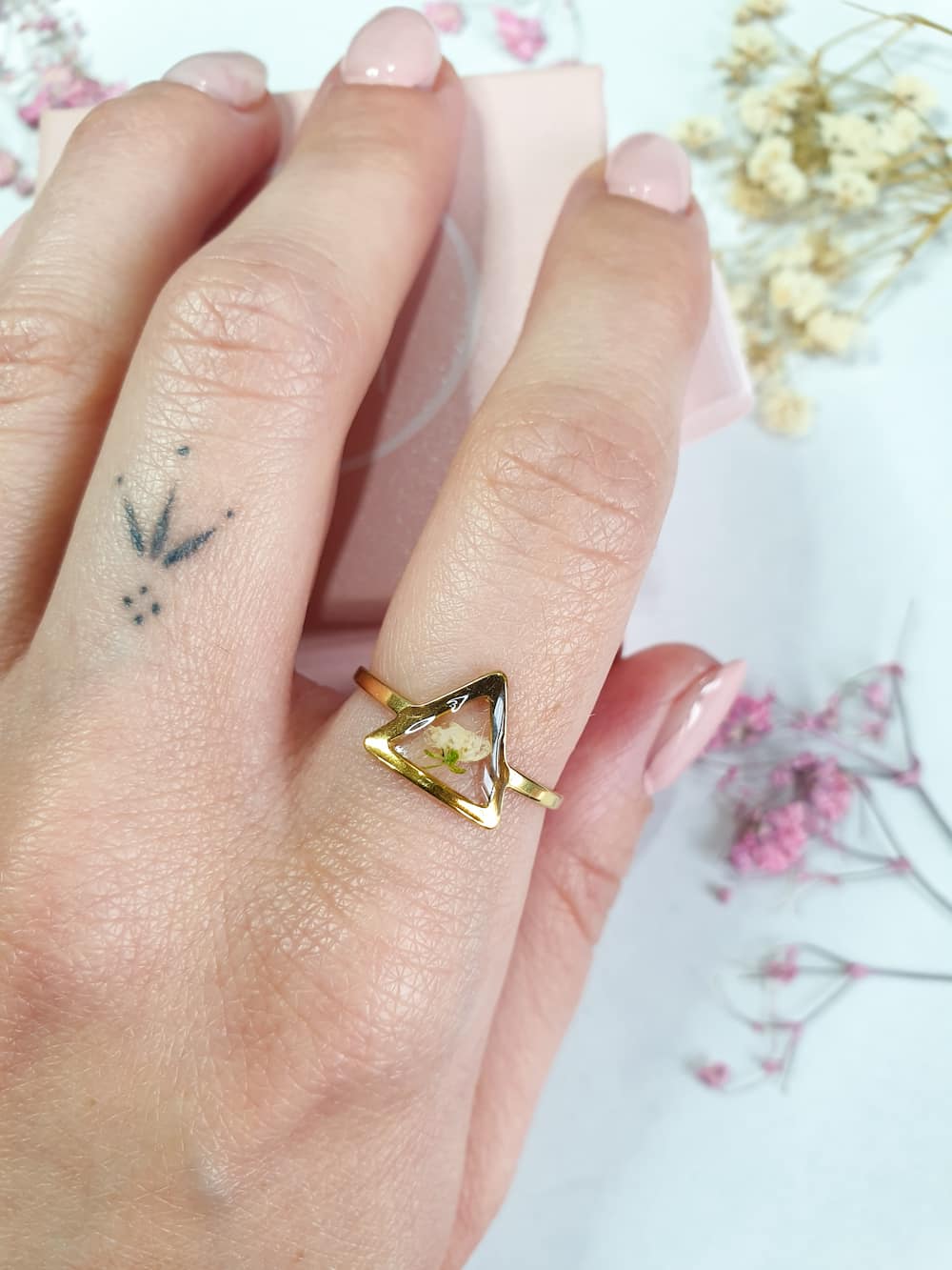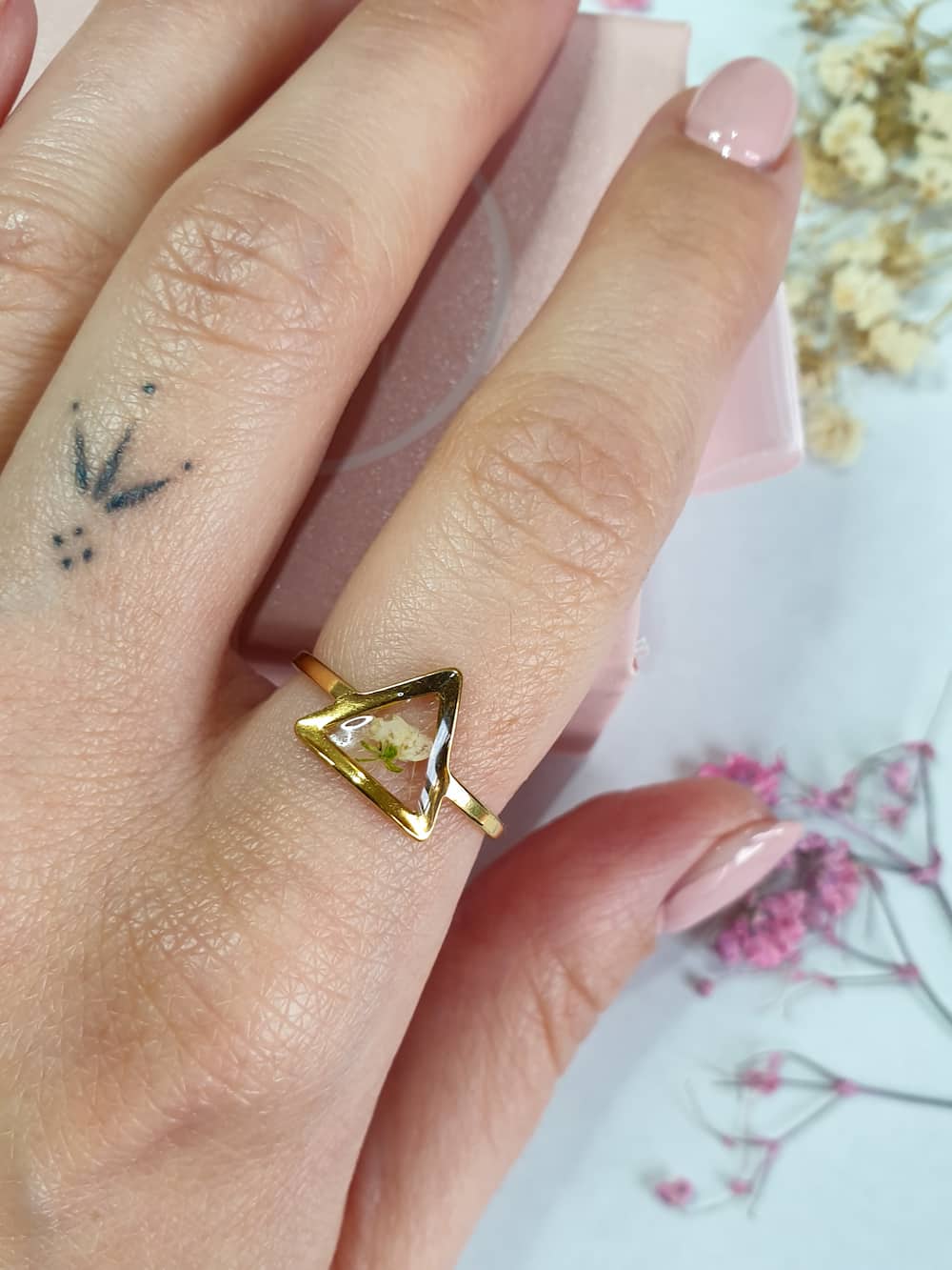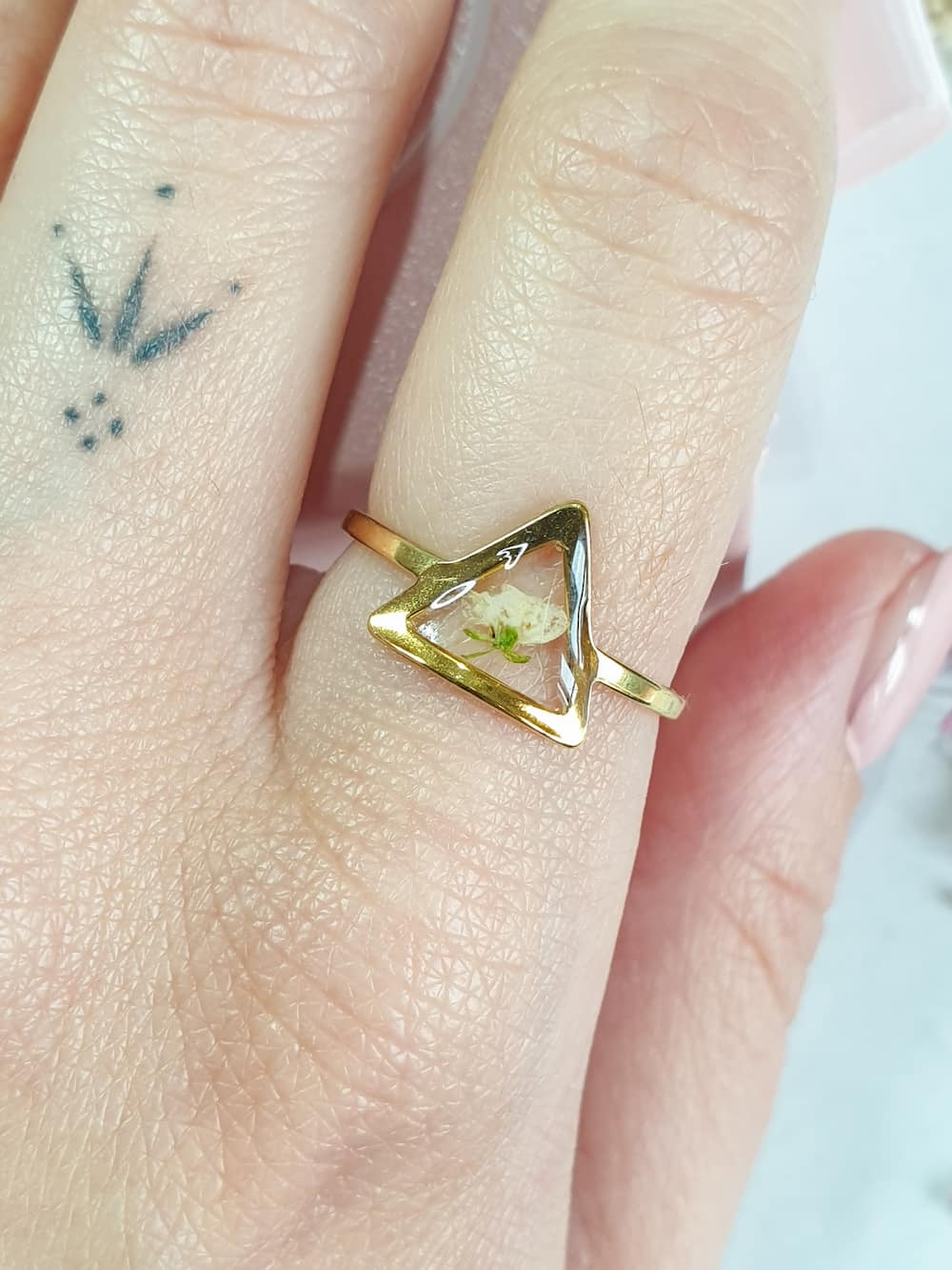 Anello in acciaio inossidabile dorato con un micro fiorellino di alisso bianco su base trasparente a triangolo.