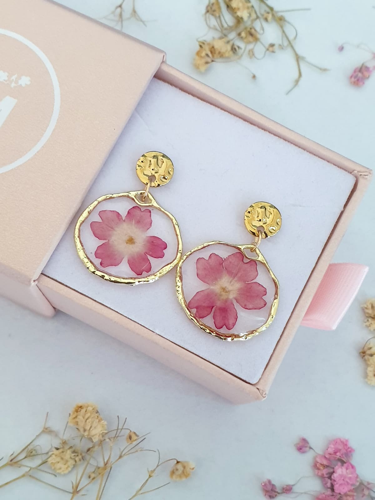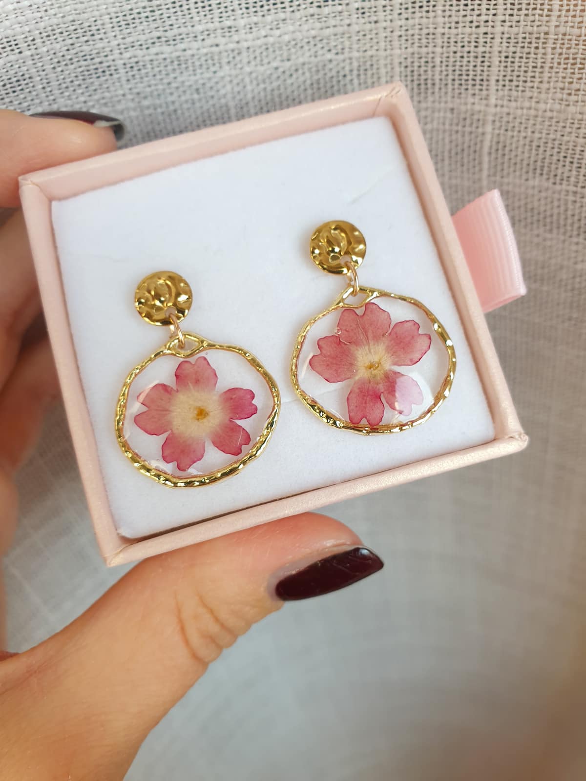 Orecchini a lobo in acciaio inossidabile con pendenti a cerchio esagonale in ottone placcato oro 18k e fiori in resina.